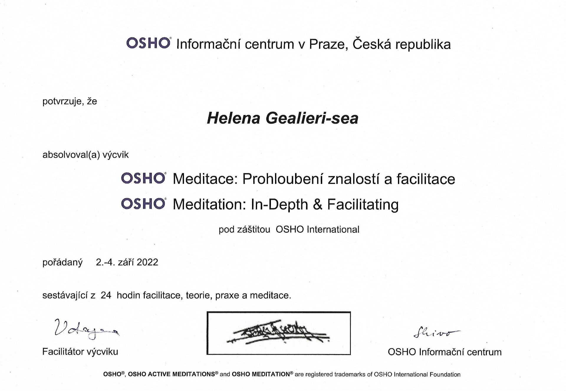 Mám lektorský kurz na Osho meditace s certifikátem na facilitaci.